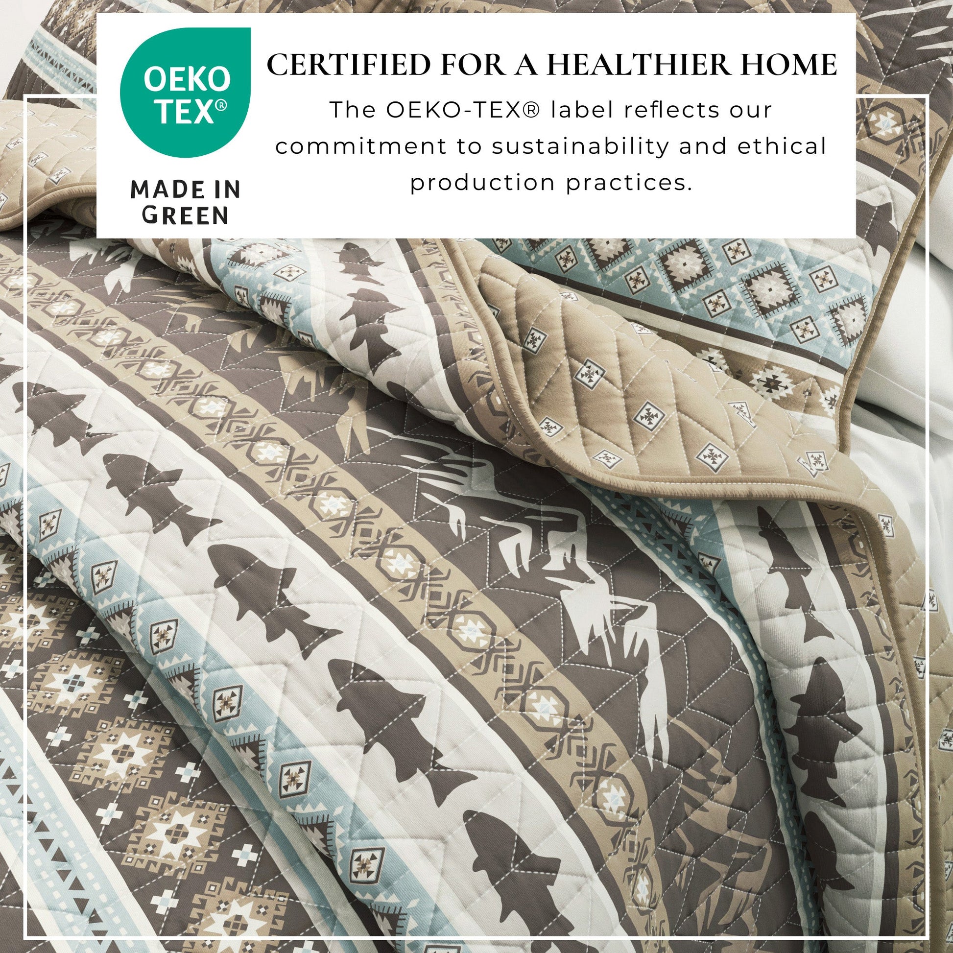 Bring the calming tones of nature into your home with this 3-piece set quilt from our Yosemite Collection. From the mountain ranges, the fish and the moose you won't miss out on any part of nature when you're wrapped up in this reversible quilt set. Perfect coziness for all year round.